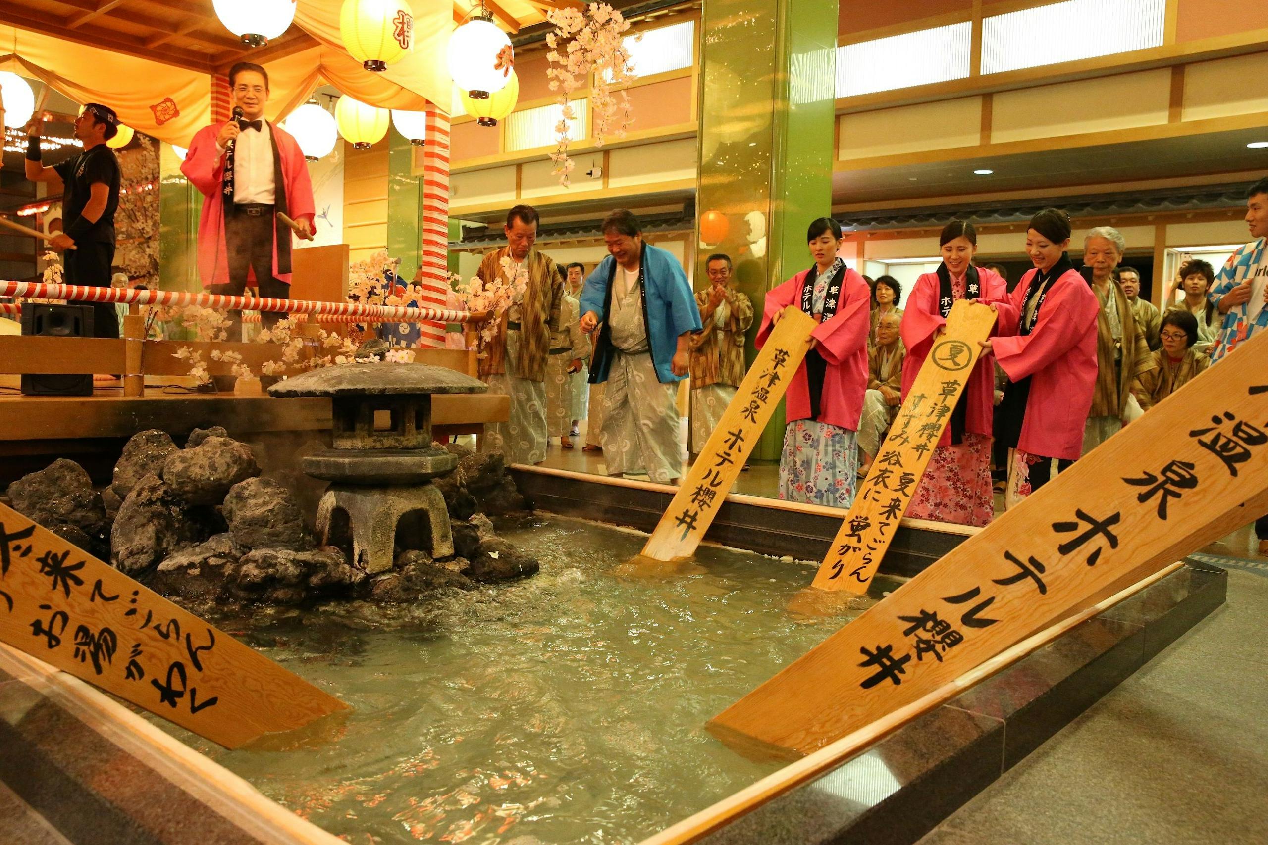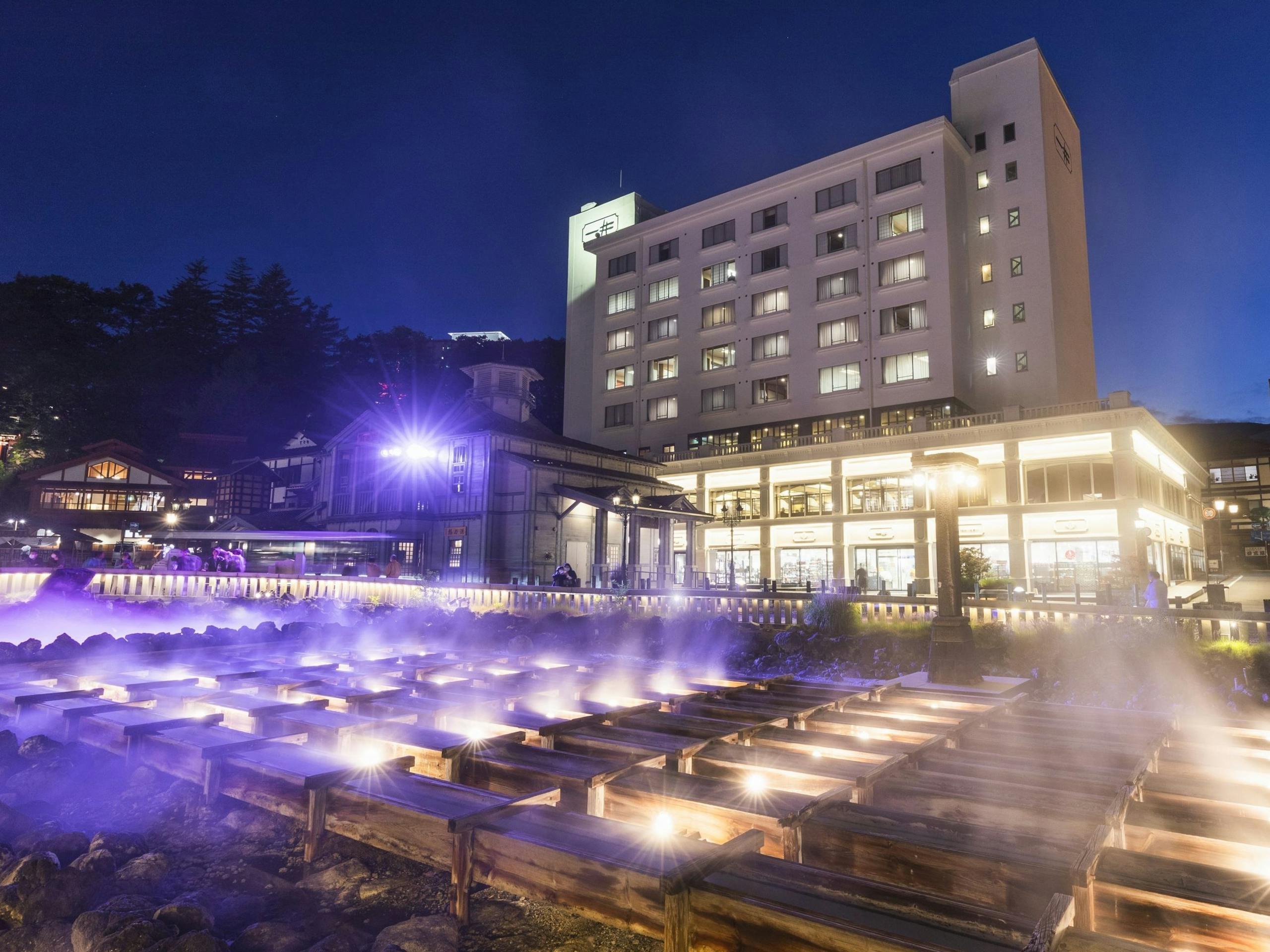 湯畑から徒歩0分。湯畑の正面にある大型ホテルで、湯畑を望める客室は25室あります。主に和室の客室で、客室温泉露天風呂付のお部屋はありませんが、2021年に大浴場がリニューアルされて綺麗になりました。内湯と露天風呂は男女入替制、温泉の温度が3つに分かれており、熱めが好きな方もぬるめが好きな方も好みの温度の温泉を堪能できます。大浴場は、白旗源泉と万代鉱源泉の2つの源泉を引いています。