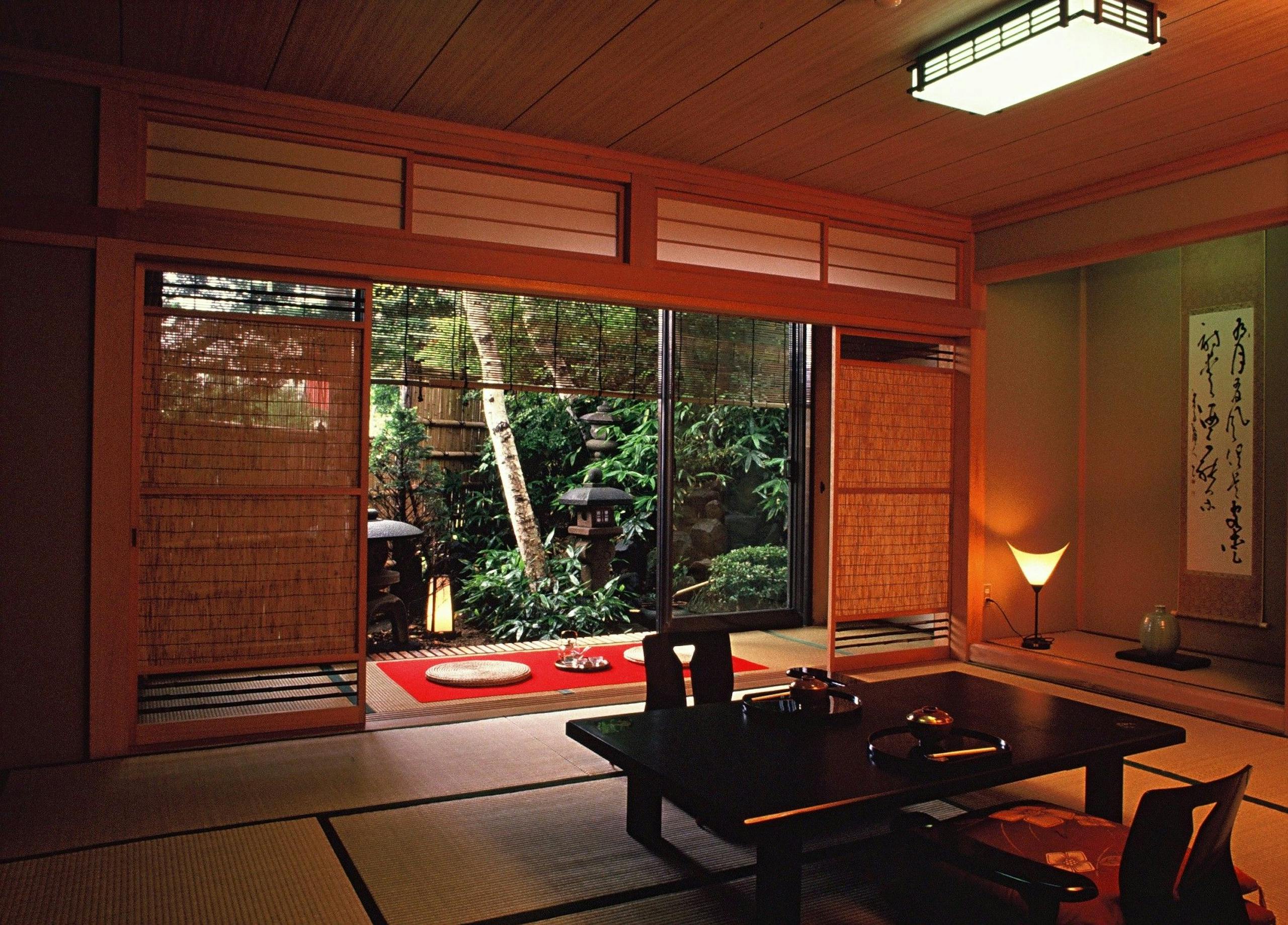 全12室の和室で、日本庭園が望める広々とした客室を備えています。(別邸にはベッドの客室有り。)夜間は行燈が点灯し、別世界のような雰囲気です。